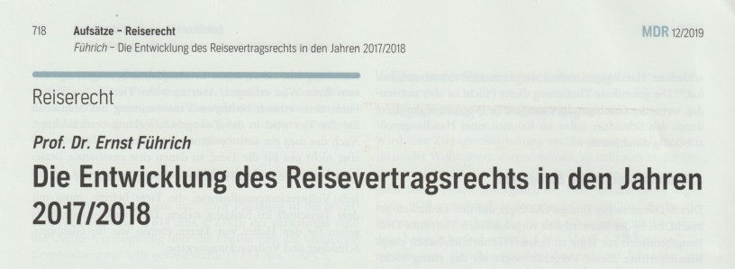 Der Aufsatz von Prof. Dr. Ernst Führich in der juristischen Fachzeitschrift Monatsschrift für Deutsches Recht (MDR) schließt an den Bericht in MDR 2016, 566 an und stellt die deutsche und unionsrechtliche Rechtsprechung und die Entwicklung der Gesetzgebung der Jahre 2017 und 2018 dar. Erfasst wird das alte Reisevertragsrecht der Pauschalreise vor dem Dritten Reiserechtsänderungsgesetz vom 17.7.2017, das für ab 1.7.2018 geschlossene Pauschalreiseverträge der §§ 651a bis y BGB anzuwenden ist. Insoweit werden auch die Bezüge zum neuen Pauschalreiserecht hergestellt.