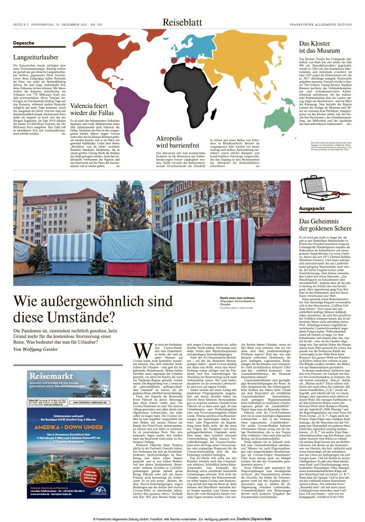 Doch der Experte für Reiserecht Ernst Führich ist davon überzeugt, dass diese Zeiten vorbei sind. Die Corona-Pandemie sei zum Teil unseres Alltags geworden und zähle damit zum allgemeinen Lebensrisiko, das jeder selbst zu tragen habe.