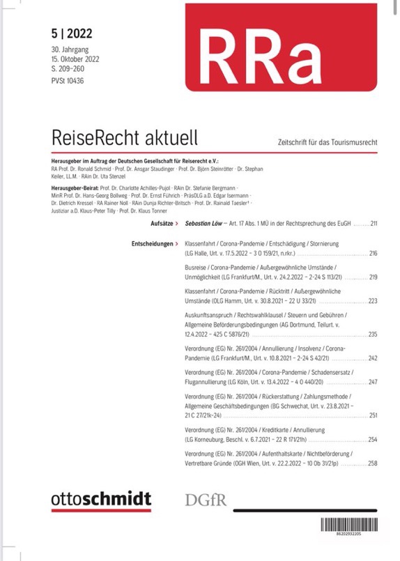 Führich Aufsatz, Reiserecht Heft 5/2022 der ReiseRecht aktuell RRa ist erschienen Datum: 18. November 2022Autor: Prof. Dr. Ernst Führich 0 Kommentare Teilen mit:Tweet Klicken, um einem Freund einen Link per E-Mail zu senden (Wird in neuem Fenster geöffnet) E-Mail Klicken zum Ausdrucken (Wird in neuem Fenster geöffnet) Drucken Klicken, um auf WhatsApp zu teilen (Wird in neuem Fenster geöffnet) WhatsApp Gefällt mir Wird geladen …