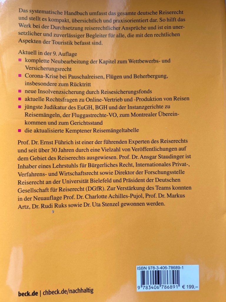 Handbuch des Pauschalreise-, Reisevermittlungs-, Reiseversicherungs- und Individualreiserechts. Hrsg. von Ernst Führich und Ansgar Staudinger. 9., neu bearb. Auflage. – München, Beck 2024. LXVI, 1351 S., geb. EUR 199,–. ISBN 978-3-406-78689-1.