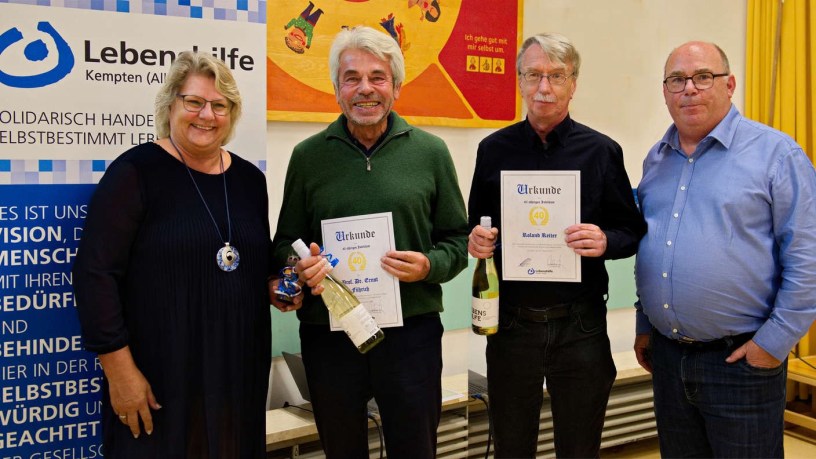 Ein wichtiger Bestandteil der Mitgliederversammlung war auch wieder die Ehrung der langjährigen Mitglieder. Neben den zehn- und 20-jährigen gab es in diesem Jahr auch zwei Mitglieder, die bereits 40 Jahre dabei sind. Unser Foto zeigt (v. l.) die stellvertretende Vorsitzende Waltraud Bickel, Professor Dr. Ernst Führich, Roland Reiter und der 1. Vorsitzender Bernhard Schmidt (dieser feiert 2024 sein 20-jähriges Jubiläum in der Lebenshilfe Kempten). © moriprint